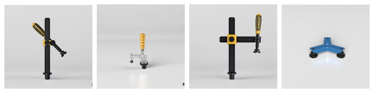 Используют в тех случаях, когда важно соблюсти точный угол соединения. Угловые струбцины благодаря сквозным отверстиям на корпусе, легко крепятся на стол или верстак. Но имеют ограниченные возможности при необходимости фиксации крупных элементов.