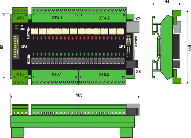 Для подключения внешних устройств используются колодки с винтовыми зажимами для проводов XT4, XT6. Для подачи внешнего питания входов/выходов используются колодки XT3, XT5. Для сигнализации о текущем состоянии, напротив клемм каждого входа/выхода, установлены световые индикаторы. Зелёного цвета для входов и красного для выходов. Программирование контроллера и отладка программы электроавтоматики осуществляется от персонального компьютера через разъём X7 (USB тип B).